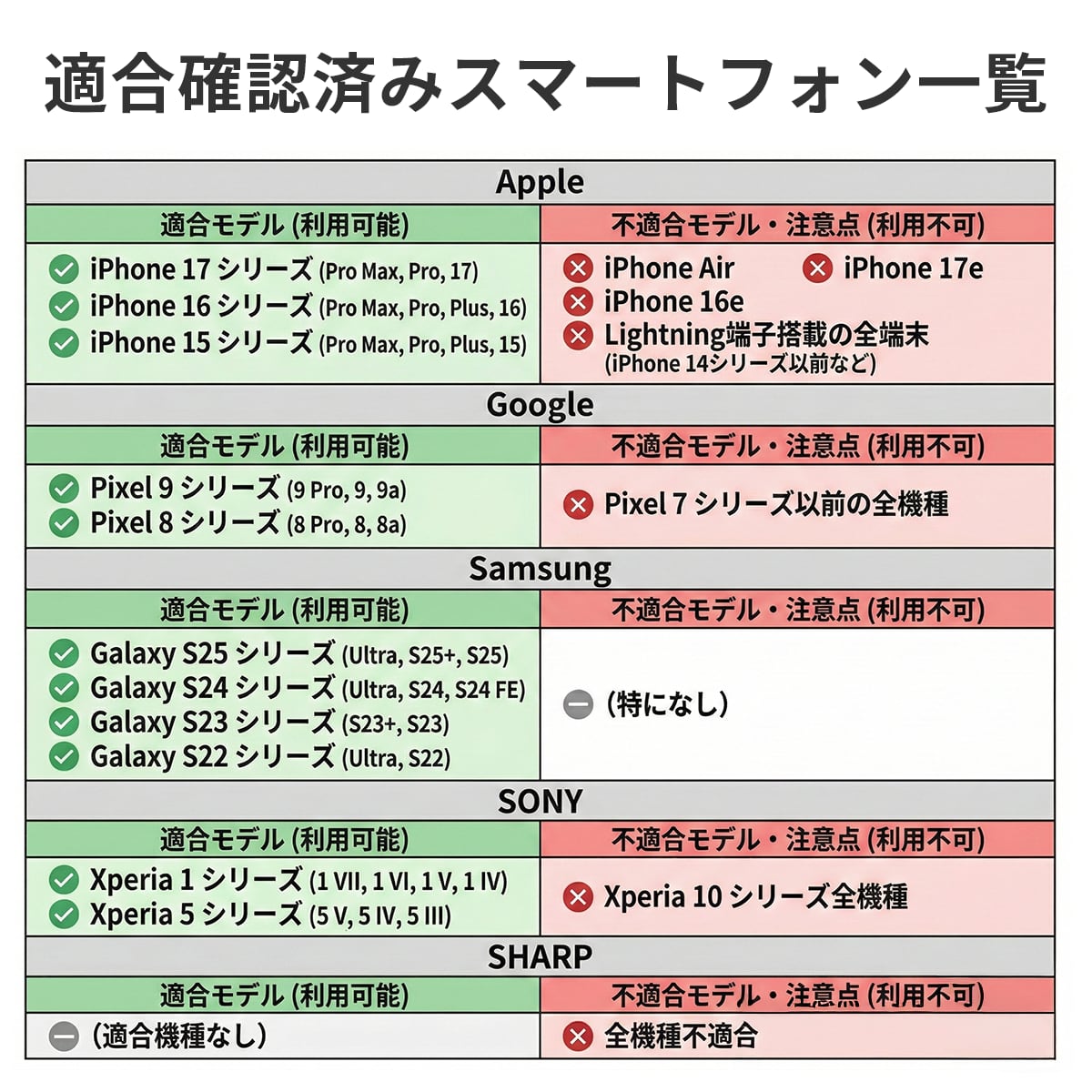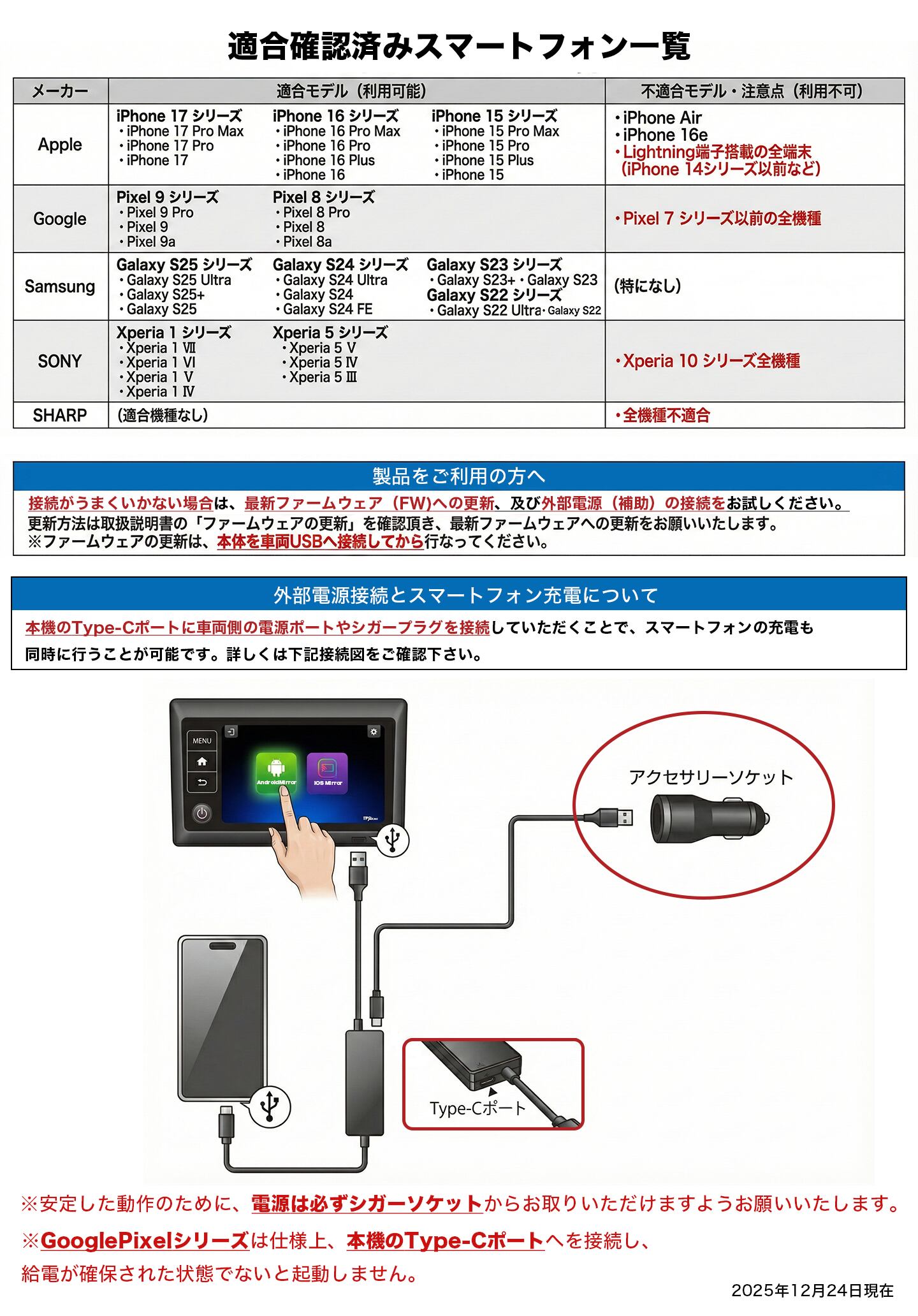 【ご購入前に必ずご確認ください】 本製品を正常にご利用いただくには、スマートフォンと車両の両方が以下の条件を満たしている必要があります。 【1. スマートフォン側の必須条件】 ご使用の端末が「DP Altモード (DisplayPort Alternate Mode)」に対応している必要があります。 ・主な非対応機種: Lightning端子のiPhone、iPhone 16e、iPhone Air、Google Pixelシリーズ、SHARP製スマートフォン全般、Galaxy Aシリーズ、OPPO Reno Aシリーズ など ※Google Pixelシリーズをご利用の場合: 動作不安定の為、DPAltモードに対応している場合も不適合 【2. 車両側の必須適合条件】 以下の3点をすべて満たしている必要があります。 ・メーカー純正ディスプレイオーディオ搭載車 ・「有線のApple CarPlay」に対応していること ・ディスプレイがタッチパネル操作に対応していること ※トヨタ車をご利用の場合: Pixelシリーズ同様、動作安定のため補助電源(シガー電源)の接続が必須となります。