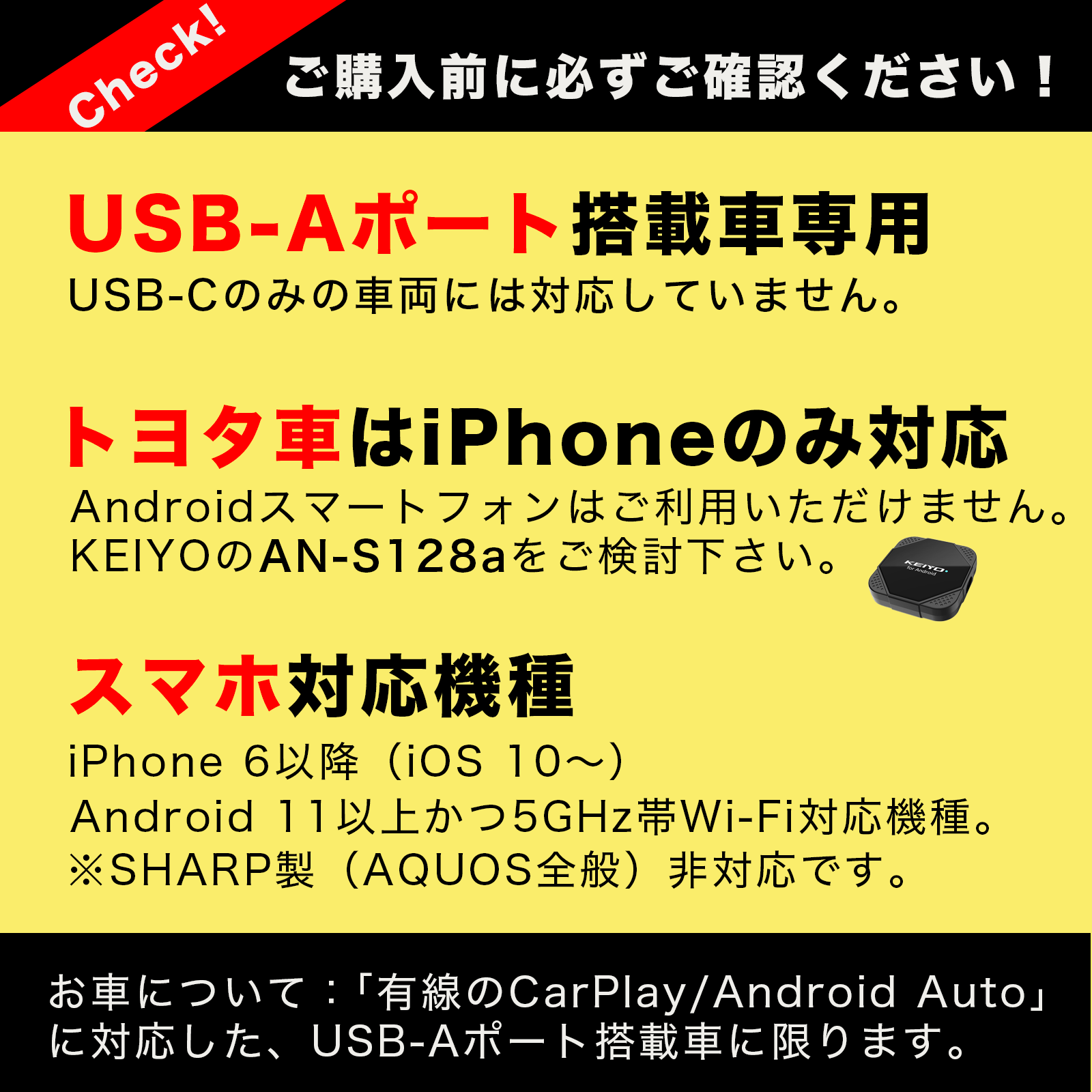 お車について:「有線のCarPlay/Android Auto」に対応した、USB-Aポート搭載車に限ります。